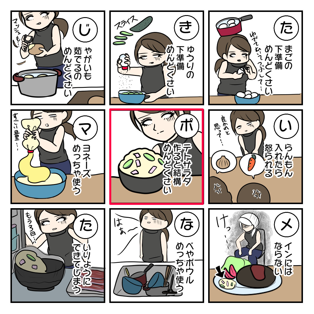 いつもご覧いただきありがとうございます。 白目育児カルタです。 1.ポテトサラダ作ると結構めんどくさい #ワーママことわざカルタ 「ポテトサラダ作ると結構めんどくさい」 作らへん人から見たら簡単に見えるかもしれんけど「じゃあ作ってみろこの野...