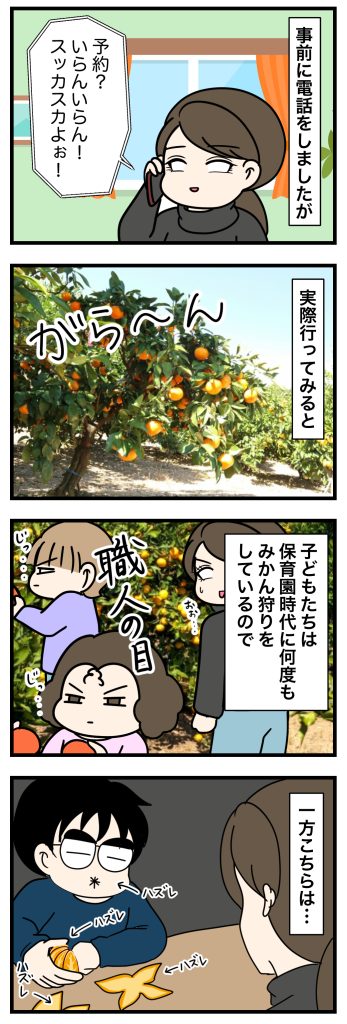 スポンサーリンク おすすめ記事ボスママBさん【1】武田ゆめは美人なのに男運が悪い1猫いると毎日がミステリー①「白目家の3ネコ」すくパラぷらすー心理士連載ー白目むきながら心理カウンセラーが泣いた日ーアフター... みかん狩りに行った話① 🐱【漫画】白目家の日常2022.11.102023.06.30スポンサーリンク いつもご覧いただきありがとうございますNEW!▼その他書籍も好評発売中広告 その2へ続きます みかん狩りに行った話②家族でみかん狩りに行ってみたところ、この時期なのになぜかガラガラ。保育園でみかん狩りなれしている娘たちは職人のような目でみかんを吟味。少し平べったいもの、黄色よりはオレンジ色の強いもの、少し柔らかくなっているものなど、甘いみかんを必ず引き当ててくるのですが、なぜか夫は酸っぱいものばかり。もしかして神様から…?別のお話 長女はまめきちまめこさんが好きすぎる話小学生の娘たちは学童のない日は私よりも早く帰ってくるので。「ついたよー」とか「○○していい?」とかの連絡ができるように古いスマホにあれこれ設定し、LINEとカメラだけ使えるようにして家でWi-Fi環境でのみ使えるようにしてるんですよね 検索... contents広告 0