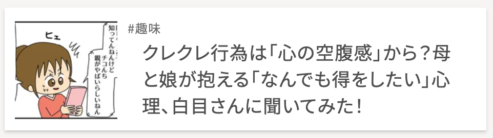 スポンサーリンク おすすめ記事ボスママBさん【1】武田ゆめは美人なのに男運が悪い1猫いると毎日がミステリー①「白目家の3ネコ」すくパラぷらすー心理士連載ー白目むきながら心理カウンセラーが泣いた日ーアフター... レタスクラブ番外編【心理的解説】 📖その他Web漫画2023.04.302023.09.02スポンサーリンク いつもご覧いただきありがとうございますNEW!▼その他書籍も好評発売中広告 ▼『欲しがるあの子を止められない』の心理的解説②▼『欲しがるあの子を止められない』の心理的解説①▼『チンカルボー』の心理的解説▼『150万のバッグが欲しい主婦の夫に内緒の買い物日記』の心理的解説▼『私が誰だかわかりましたか?』の心理的解説▼レタスクラブ漫画連載はこちら contents広告 広告 1