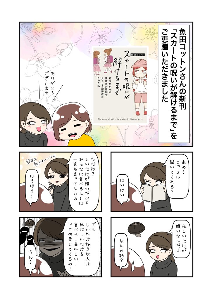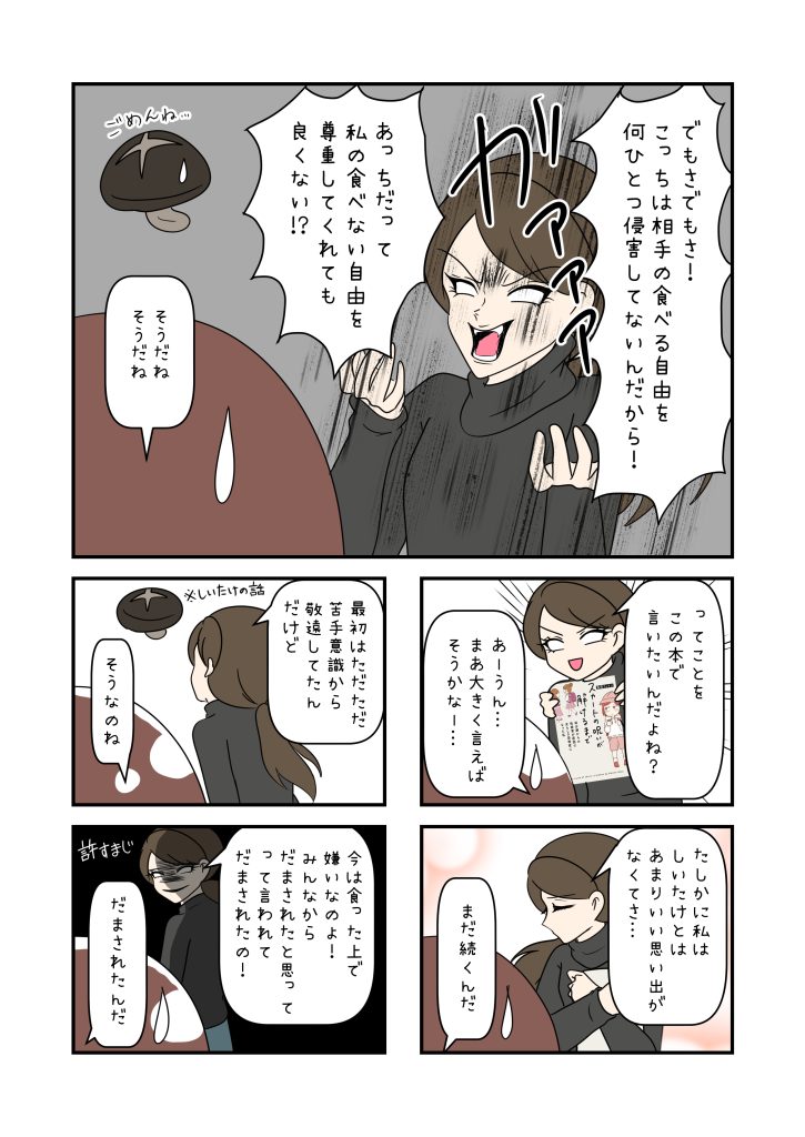ただ先ほどもお伝えしたよう椎茸には恨みはなく。単に私と椎茸の問題なんですけど。「椎茸を食え」「人生損してる」「良い椎茸を食べてないだけ」って茶々を入れてくる人への不快感は抱きます。こっちはあなたに強制していないんだから。私のことも放っておいてくれと。