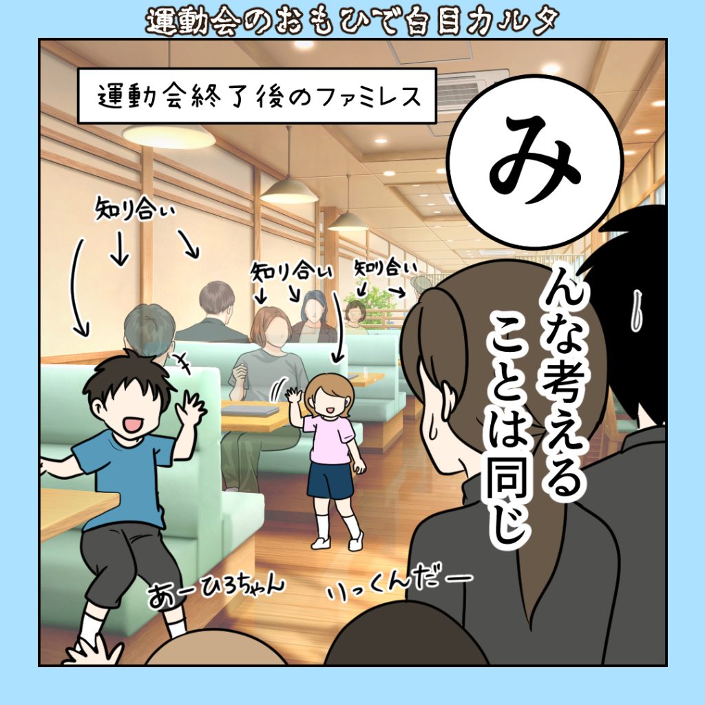 スポンサーリンク おすすめ記事ボスママBさん【1】武田ゆめは美人なのに男運が悪い1猫いると毎日がミステリー①「白目家の3ネコ」すくパラぷらすー心理士連載ー白目むきながら心理カウンセラーが泣いた日ーアフター... 【運動会で白目カルタ⑦】みんな考えることは同じ ■【カルタ】白目カルタ2024.11.19スポンサーリンク いつもご覧いただきありがとうございますNEW!▼その他書籍も好評発売中広告 ■みんな考えることは同じ最近の運動会は昼食がないので。終了後の近所のファミレスや回転寿司は知り合いだらけです。皆様運動会お疲れさまでした。 contents広告 2