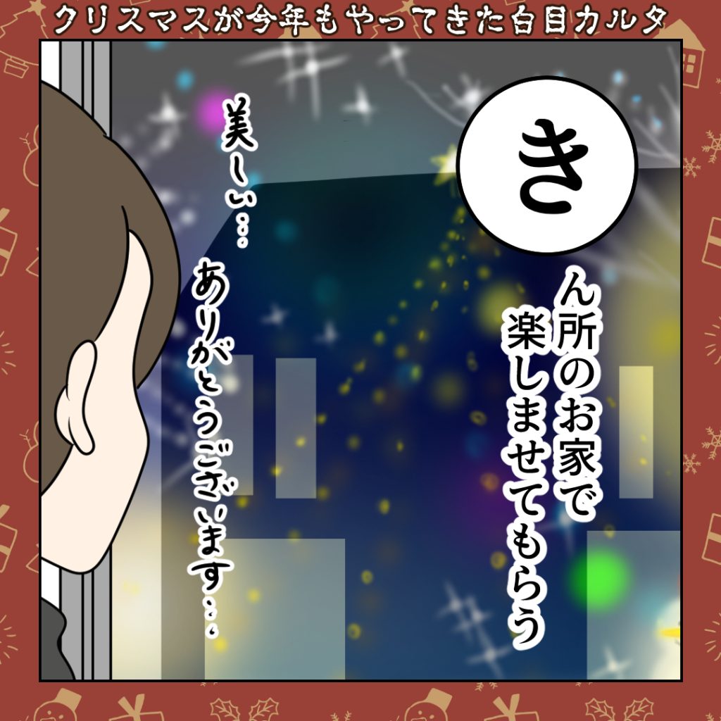 スポンサーリンク おすすめ記事ボスママBさん【1】武田ゆめは美人なのに男運が悪い1猫いると毎日がミステリー①「白目家の3ネコ」すくパラぷらすー心理士連載ー白目むきながら心理カウンセラーが泣いた日ーアフター... 【クリスマス2024】⑥近所のお家で楽しませてもらう ■【カルタ】白目カルタ2024.12.29スポンサーリンク いつもご覧いただきありがとうございますNEW!▼その他書籍も好評発売中広告 ◼︎近所のお家で楽しませてもらうイルミネーションとか見に行けないのでご近所の電飾を楽しませていただいております。ありがとうございます。 contents広告 3